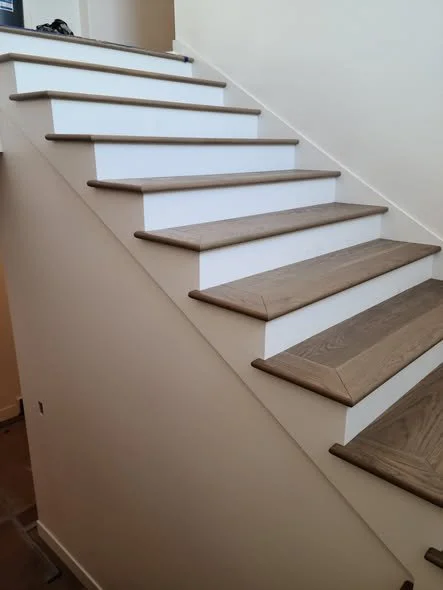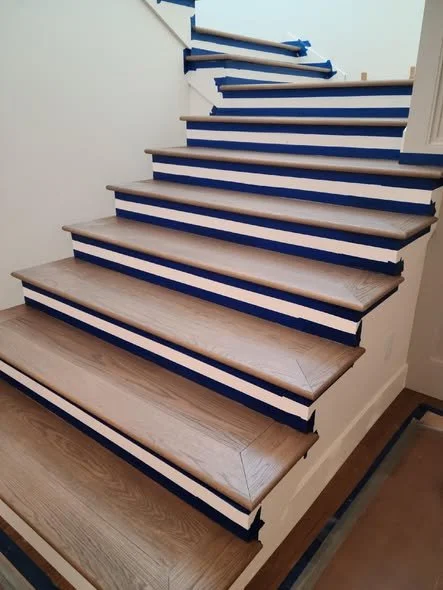 White Oak treads wire brushed and stained a custom color with painted trim.